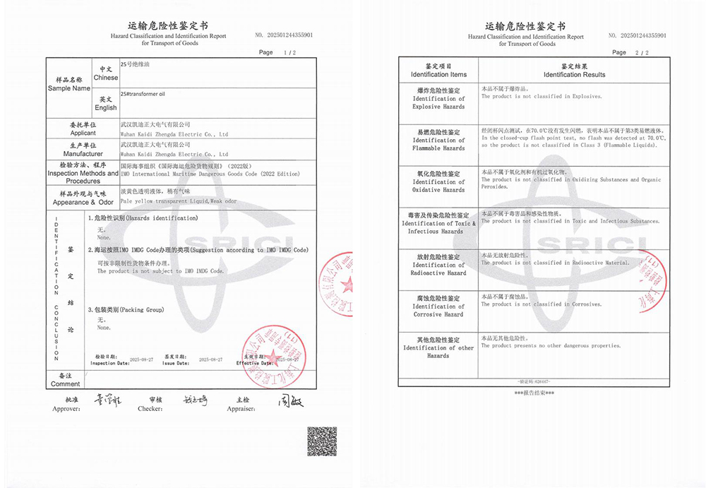 運輸危險性鑒定過程與結果詳解在國際海運中,危險品的運輸管理有著嚴格的標準與規范,油式試驗變壓器所用的絕緣油作為液體類物質,是否屬于易燃易爆危險品,需通過專業的運輸危險性鑒定予以確認。為此,武漢凱迪正大委托上海化工院檢測有限公司對KD2675設備中使用的25號絕緣油進行了全面檢測。