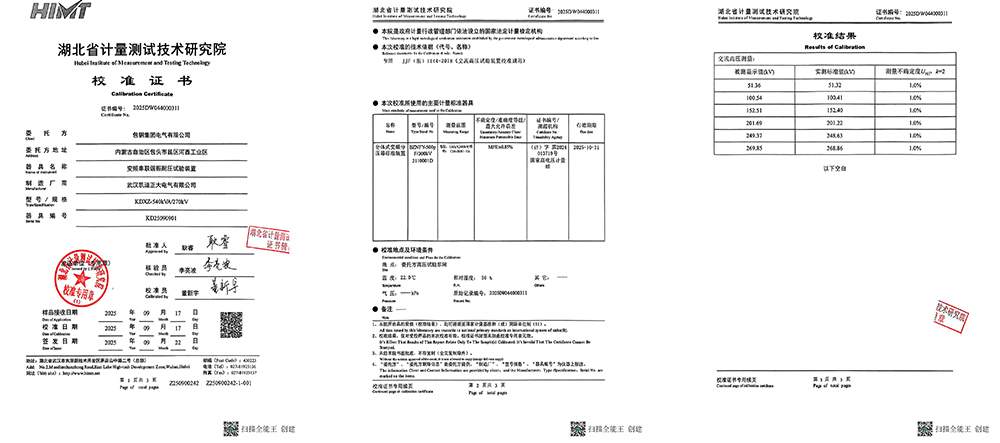 近日,包鋼集團電氣有限公司采購的KDXZ-540kVA/270kV變頻串聯諧振耐壓試驗裝置,經湖北省計量測試技術研究院完成校準并正式頒發校準證書,標志著該裝置在高壓電氣試驗領域的測量準確性與可靠性獲得國家法定計量機構的權威認可。