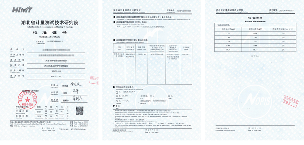 整體性能可靠:數(shù)據(jù)表明,KDZD-50B型試驗儀在其量程范圍內(nèi),測量結(jié)果準(zhǔn)確、穩(wěn)定,系統(tǒng)誤差小,具備了為高端絕緣材料測試提供可靠數(shù)據(jù)的能力。湖北省計量測試技術(shù)研究院出具的校準(zhǔn)證書確認,該臺KDZD-50B高溫漆膜電壓擊穿試驗儀的交流高壓測量功能符合預(yù)期使用要求,量值準(zhǔn)確可靠。
