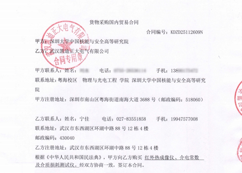 近日,深圳大學中國核能與安全高等研究院正式采購了武漢凱迪正大電氣有限公司的KDRX-2581紅外熱成像儀與KDYD-JZ介電常數及介質損耗測試儀,合同編號KDZD25112609N。